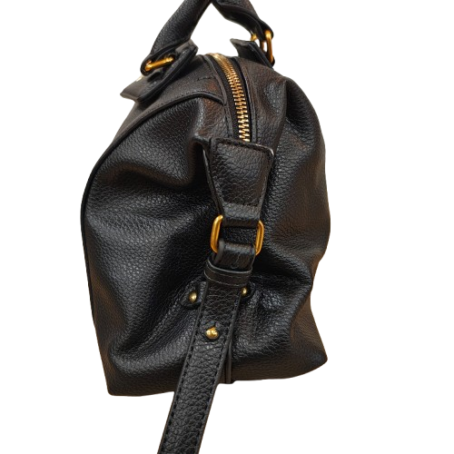 Bolso mediano. Mujer. Color negro. Detalles en dorado, contiene asa de mano y bandolera . Interior con bolsillo y forrado.