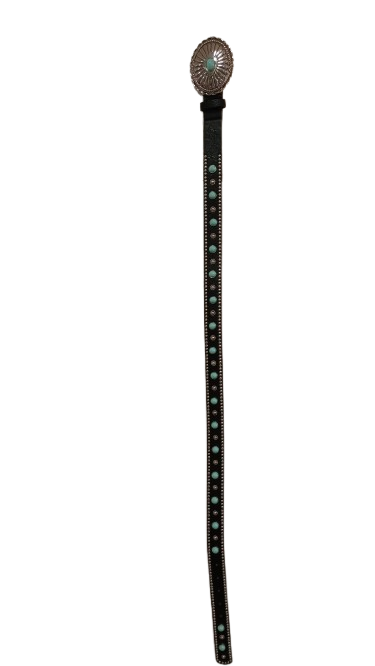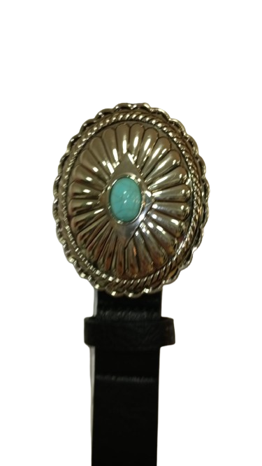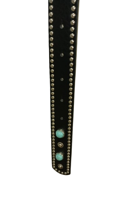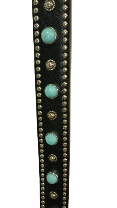 Cinturón mujer. Detalles plateados y azul celeste. Color negro